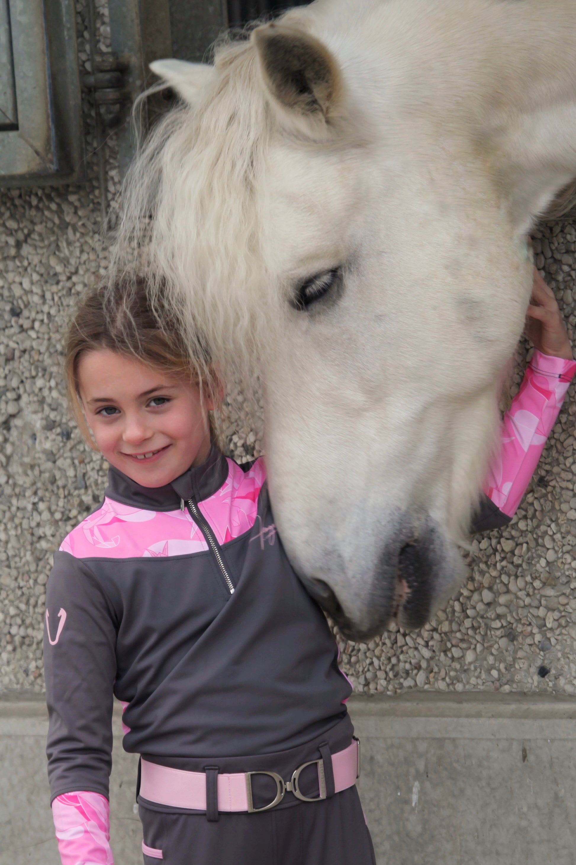 Ce base layer VGH Kids en gris élégant est idéal pour les jeunes cavalières à la recherche d’un vêtement à la fois technique et raffiné. Il se distingue par de charmants motifs chevaux baby pink placés sur les avant-bras, le col et le dos, pour une touche équestre délicate. Son tissu léger et extensible offre confort, respirabilité et liberté de mouvement — parfait pour l’équitation, l’entraînement ou en sous-couche.