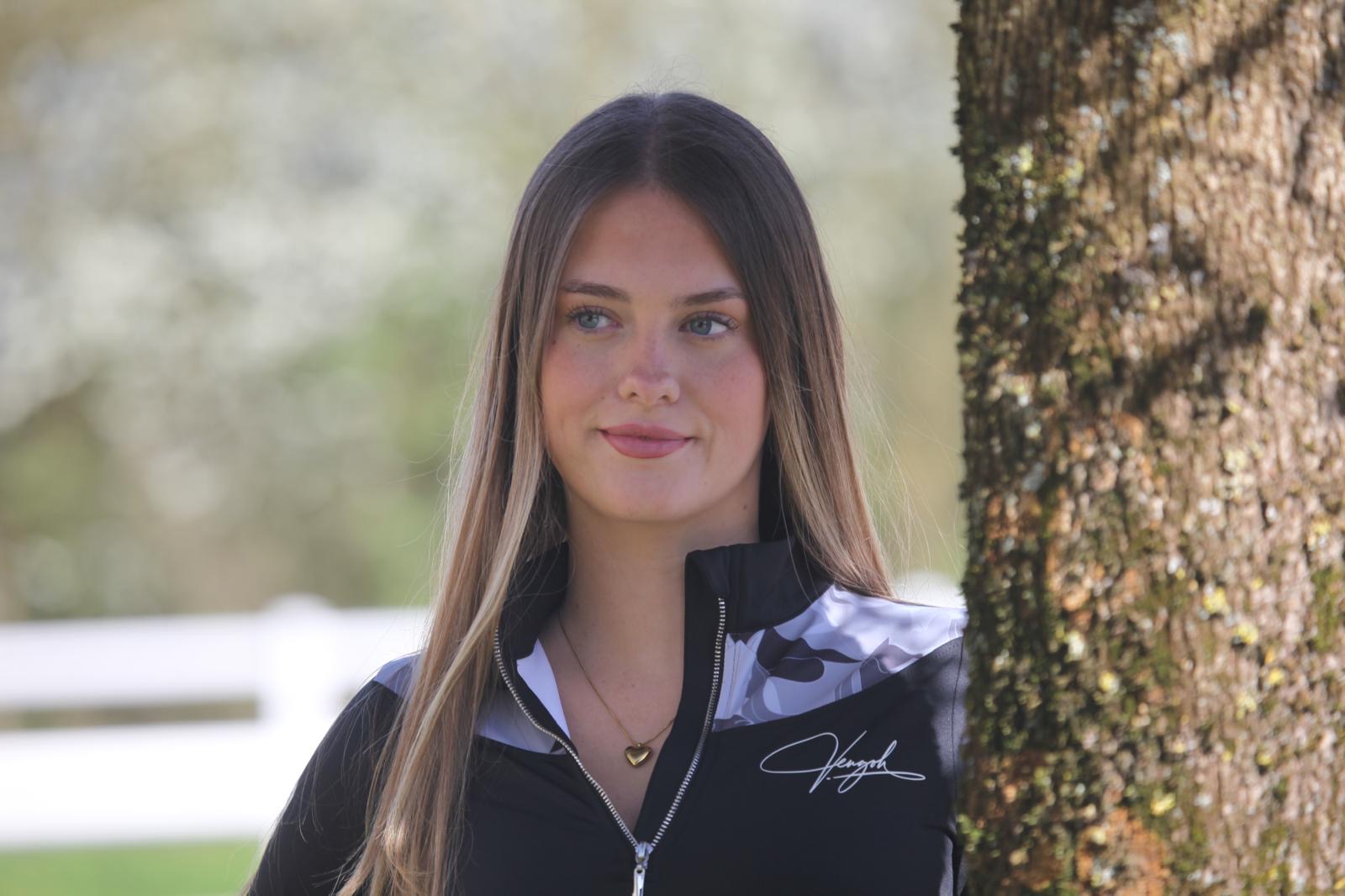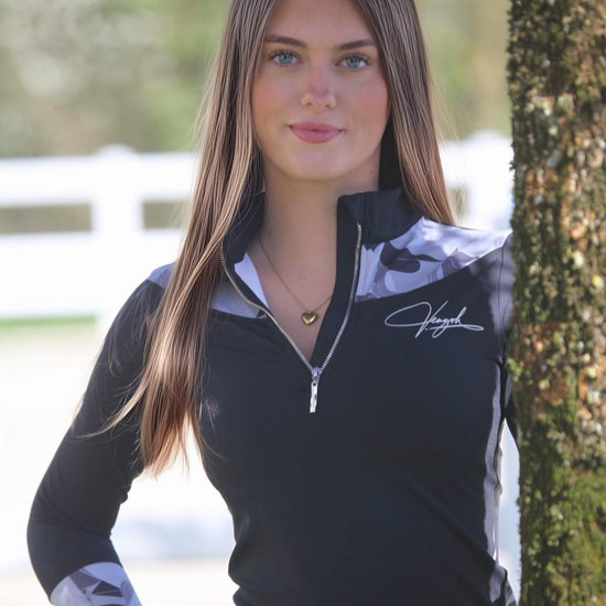 Ce base layer VGH femme associe élégance équestre et performance technique. En noir profond, il est orné de motifs chevaux gris et blancs placés sur les avant-bras, le col et sous le col à l’arrière, pour une allure subtile mais affirmée. Son tissu respirant et extensible assure confort, maintien et liberté de mouvement — idéal à cheval, à l'entraînement ou en superposition.