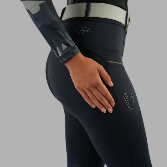 The VGH Breeches in navy bring together classic equestrian style and modern technical comfort. Featuring a tonal navy full-seat silicone grip, they ensure stability in the saddle while maintaining a clean, structured look. Cool grey piping outlines the leg line, while silver finishes—including the logo, front zipper, and button—add a polished and professional touch. Two functional hip pockets on each side complete this refined design.