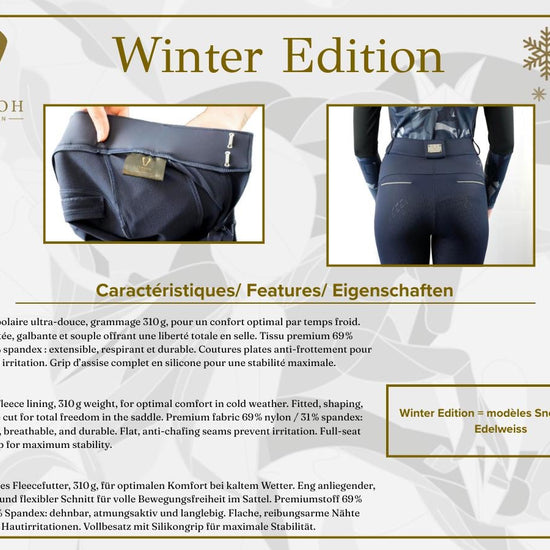 Flexibilität, Komfort und Eleganz definieren die W Fleece Breeches – Black, ein unverzichtbares Modell von Vengoh Equestrian, das Reiter in der kalten Jahreszeit stilvoll und bequem begleitet.